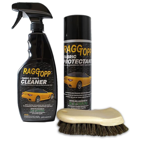 Formulated exclusively for fabric and vinyl. Use confidently to safely clean convertible tops, sport utility tops, simcon tops and tonneau covers. RaggTopp Cleaner removes the toughest roof soils and stains, retards the growth of mildrew and will actually keep dirt and grease at bay. The anti-oxidant, low pH, no bleach formula leaves NO residue. The environmentally friendly & biodegradable formula will not harm autmotive finishes, chrome, rubber, glass, or plastic windows.